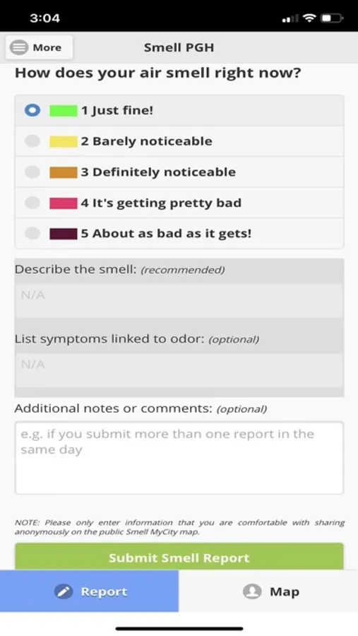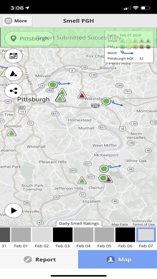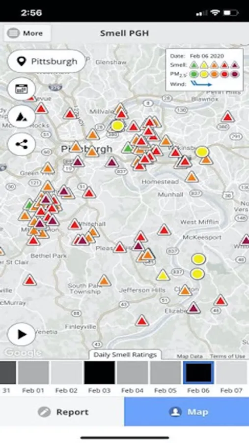 Smell Pittsburgh is a mobile phone app designed to engage Pittsburgh residents in tracking pollution odors across our region. The app also includes a map-view showing smell reports submitted in the area on a given date. This allows residents to track where odors are frequently concentrated, and link those smell events to poor air quality in, or upwind from, those areas.