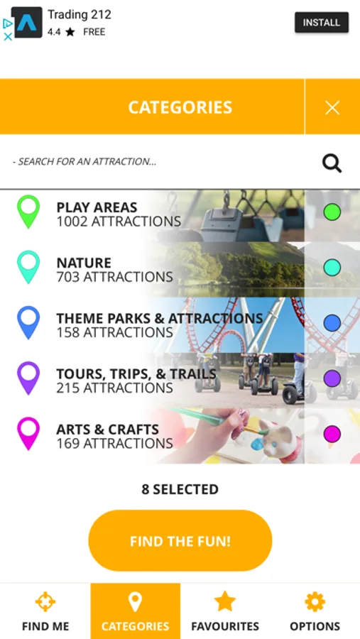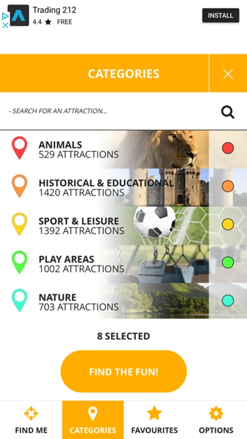 Just choose the type of attractions you are looking for (Animals, Historical & Educational, Sport & Leisure, Play Areas, Nature, Theme Parks & Attractions, Tours, Trips & Trails, or Arts & Crafts) and they will be displayed on a map of your local area. If you want to view what's available in a different area, just drag the map!
