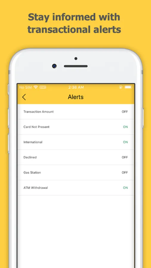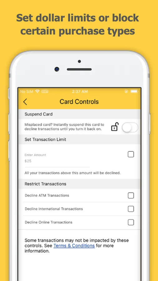 • Set up real-time alerts for declined, gas station, international transactions and ATM withdrawals