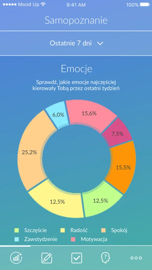 1. Samopoznanie - Funkcja, która pozwala ci dodawać codzienne wpisy o twoim samopoczuciu, odczuwanych emocjach oraz myślach, które najczęściej pojawiają się w twojej głowie. Graficzne raporty z podsumowaniem zebranych danych będą dla ciebie źródłem wielu cennych odkryć na swój własny temat.