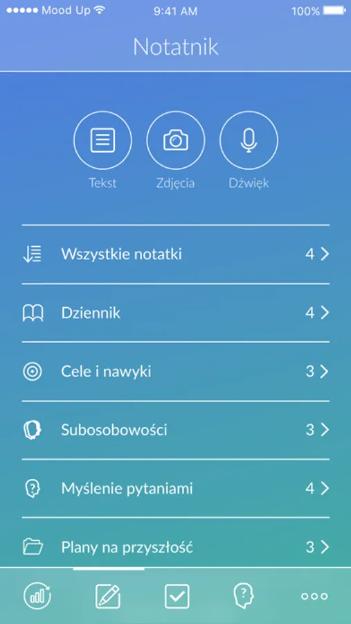 2. Notatnik - miejsce, w którym za pomocą notatek możesz gromadzić wszystkie przemyślenia na temat swojego życia i rozwoju osobistego, z podziałem na wygodne foldery i z opcją dodawania zdjęć i notatek głosowych.