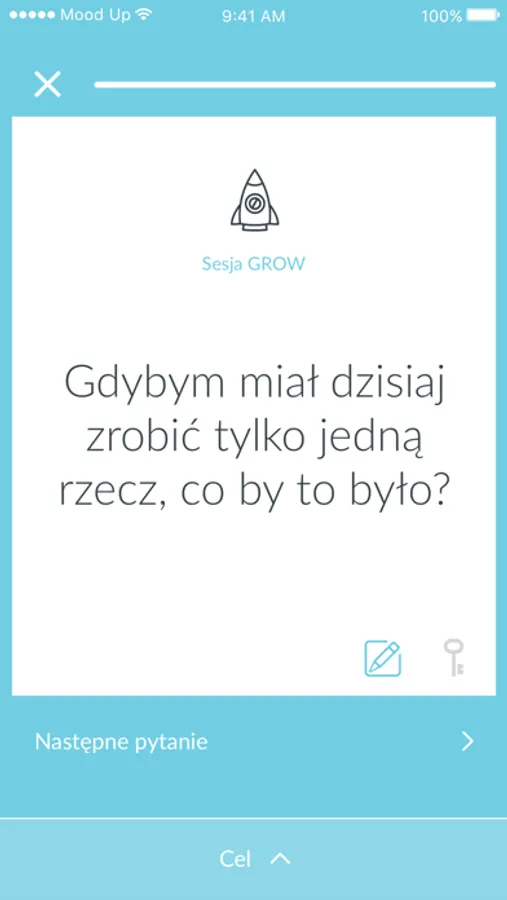 4. Myślenie pytaniami - Ten moduł to zestaw krótkich sesji coachingowych składających się z serii kart z pytaniami coachingowymi. Znajdziesz tam sesję w modelu GROW, a także sesje związane z pytaniami wspierającymi oraz wzmacniającymi. Te krótkie serie pytań posłużą ci jako dostępny na szybko sposób na uwolnienie się od stresu, znalezienie motywacji do działania i na wiele innych okazji.