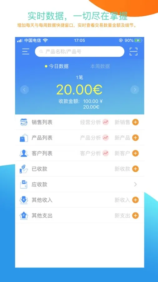增加当天与每周数据快捷窗口,实时查看交易数量金额及细节。