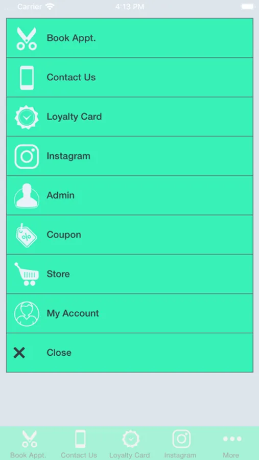 Book Appt., Call/GPS, Loyalty Cards, Coupons, Instagram, Admin