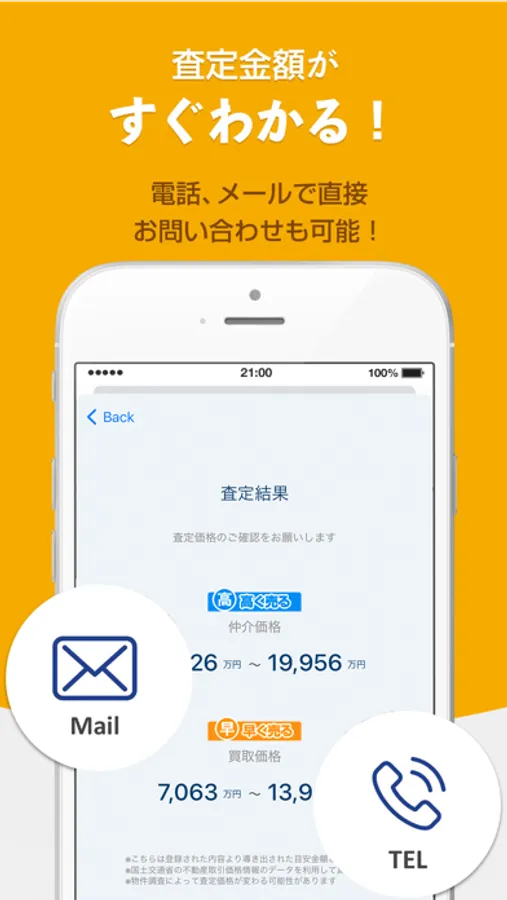 不動産の郵便番号、住所、面積、築年数等の情報を入力するだけで、仲介価格や買取価格の市場相場の簡易査定の結果がその場ですぐに金額が表示され、その結果をもとにメールでさらに詳しい査定を申し込んでいただく事が可能です。