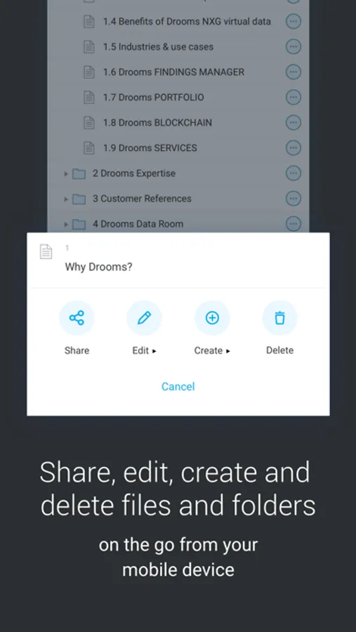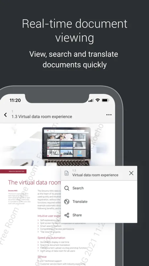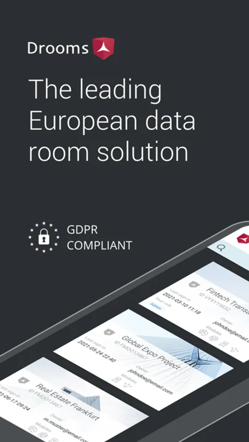 Drooms, the leading provider of virtual data rooms in Europe, allows companies controlled access to confidential corporate data across company boundaries and specialises in providing tailored solutions for the entire value chain and lifecycle management of assets. Confidential business processes such as commercial real estate sales, mergers and acquisitions, non-performing loans (NPL) transactions and board communications are handled securely, transparently and efficiently by Drooms. Available on iOS, via browser and as a desktop client you can easily access your files anytime, anywhere.