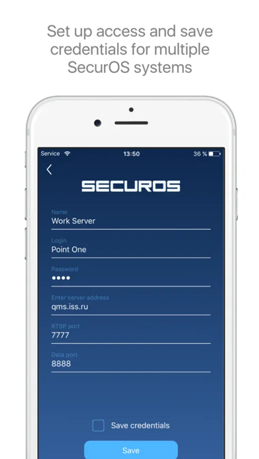 SecurOS Mobile comes with built-in cloud demo server connection for testing and evaluation purposes. For commercial use you need to have a SecurOS system installed on your server.