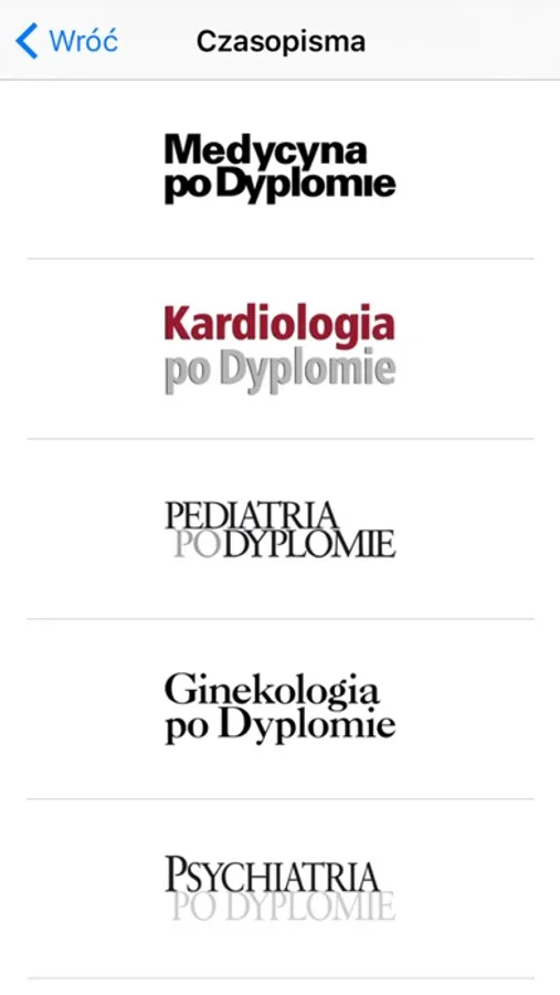 Aplikacja prezentuje publikacje: Stany nagłe pod red. Tomasza Hryniewieckiego, Medycyna po Dyplomie, Medical Tribune, Ginekologia po Dyplomie, Pediatria po Dyplomie, Kardiologia po Dyplomie, Diabetologia po Dyplomie, Dermatologia po Dyplomie, Psychiatria po Dyplomie, Neurologia po Dyplomie, Chirurgia po Dyplomie, Onkologia po Dyplomie, Dermatologia po Dyplomie, Okulistyka po Dyplomie, Medical Tribune Stomatologia, Magazyn Weterynaryjny, Weterynaria po Dyplomie. Są one przeznaczone dla lekarzy różnych specjalności, przede wszystkim zaś dla internistów i lekarzy podstawowej opieki zdrowotnej, lekarzy rodzinnych, a także pediatrów, ginekologów, chirurgów, dermatologów, diabetologów, kardiologów, neurologów, psychiatrów, onkologów, stomatologów, lekarzy weterynarii. Przekazują aktualną, nowoczesną i praktyczną wiedzę medyczną.