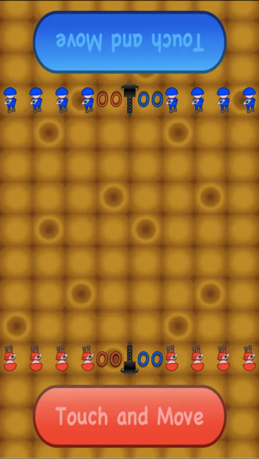 The two players were placed facing each other, each player has a submachine gun to shoot and 8 soldiers to send against the enemy.