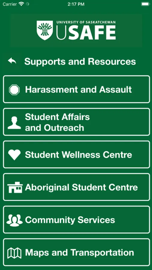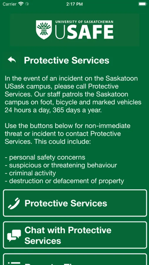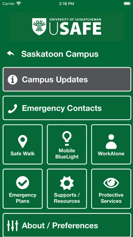 uSafe is the official safety app of the University of Saskatchewan. It is the only app that integrates with the University of Saskatchewan's safety and security systems. Protective Services has worked to develop a unique app that provides students, faculty and staff with added safety on the University of Saskatchewan campus. The app will send you important safety alerts and provide instant access to campus safety resources.