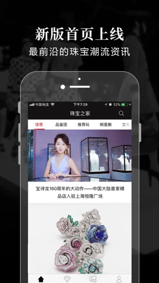 首页精选包括同步于PC端的珠宝原创文章、珠宝产品深度解析、品牌前沿资讯、和最新最热的活动报道。同时关联文章中提及的相关产品和类似的文章推荐,方便用户查找任何一款珠宝产品的更多信息。