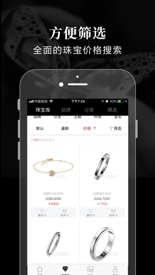 珠宝库以精美图片加材质、价格等信息,全面展示了包括几十家珠宝品牌的上万件产品,每款产品下均有点赞、评论、转发功能,与用户紧密互动。