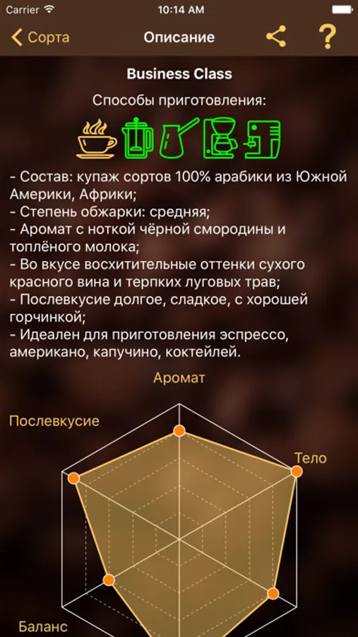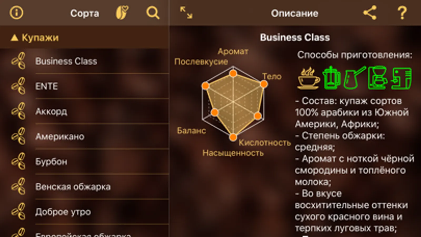 - Все о кофе: детальная диаграмма вкуса дает полное предоставление о выбранном кофе как, например, описание вкуса, месте произрастания, размерах зерен, обжарка и т.д.