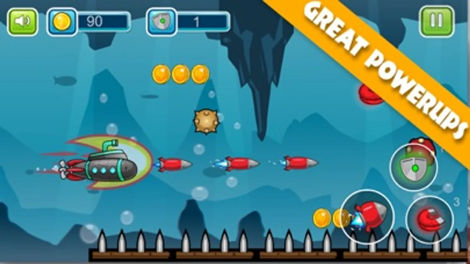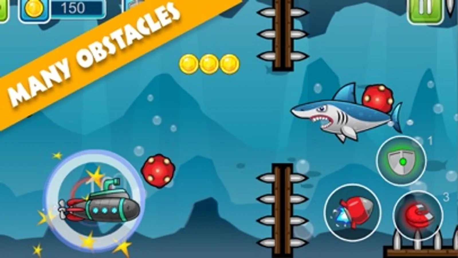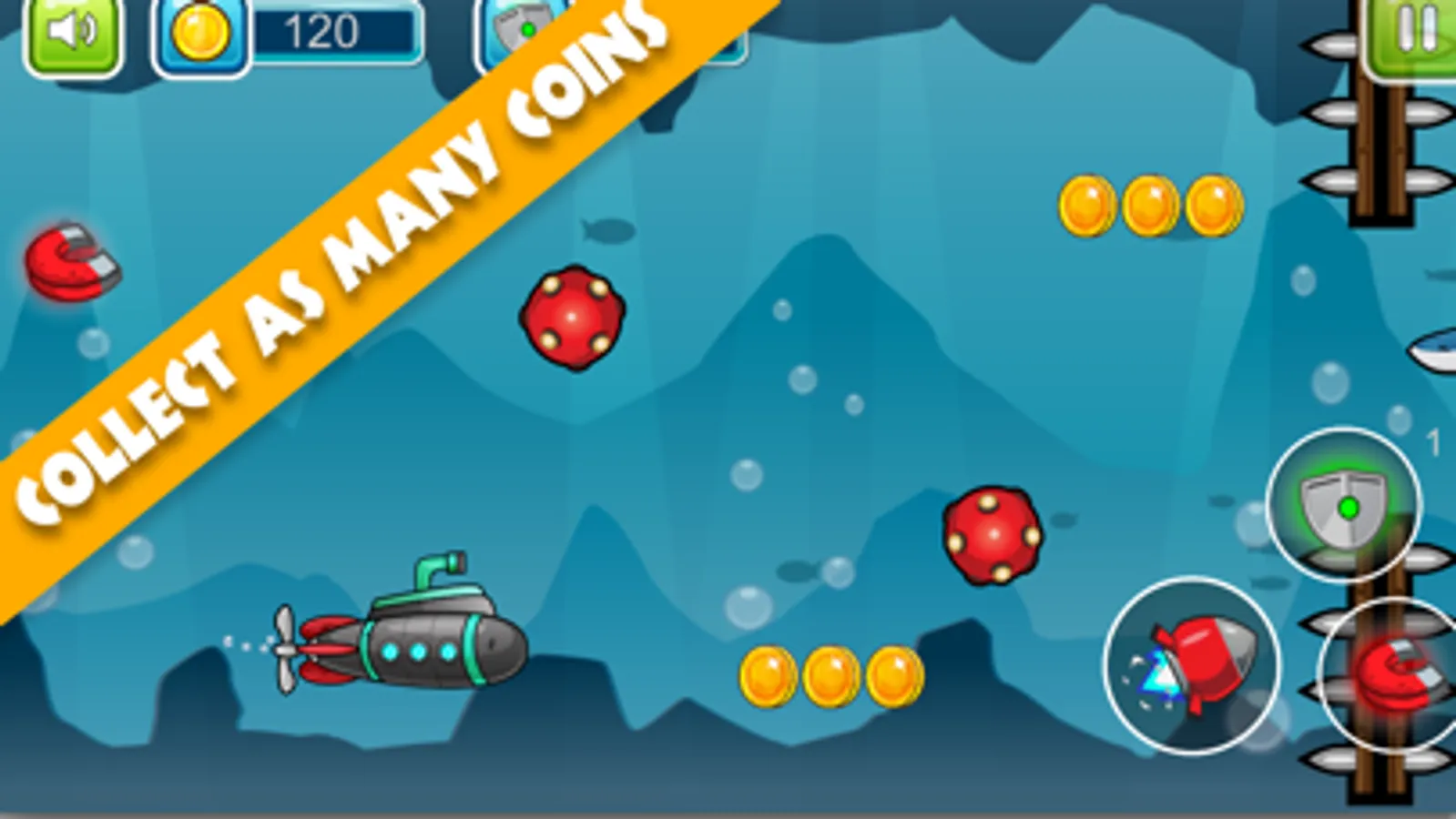 Submarine Adventure is a simple yet very addictive game. The game play is very simple, just tap to move/up and use the buttons to launch a torpedo and add a shield or use a coin-magnet. Very addictive and cool game play with great sound effects.