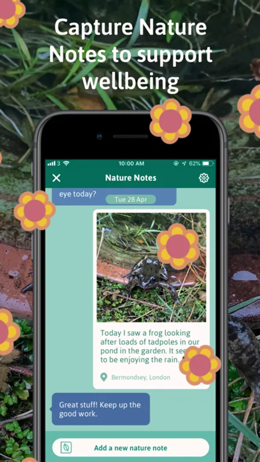 • Use our Nature Notes feature to capture the good things you see in nature and bring about clinically significant benefits to mental wellbeing