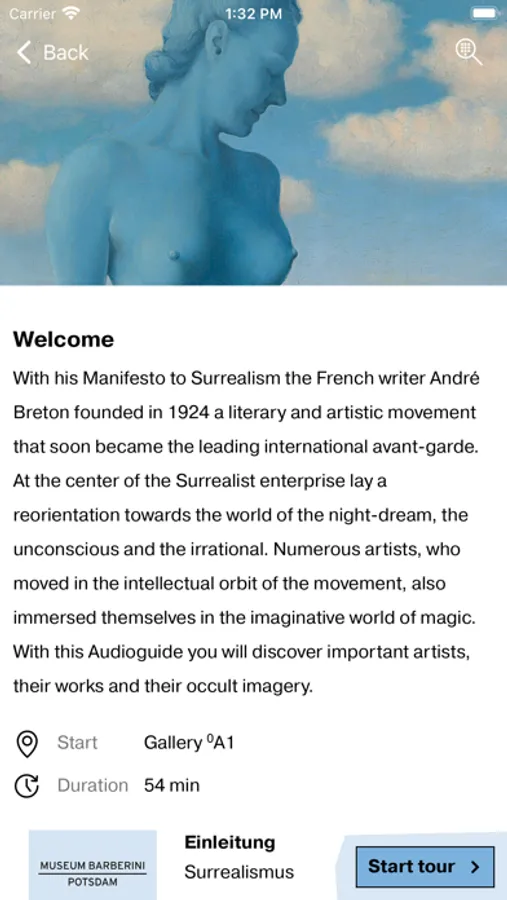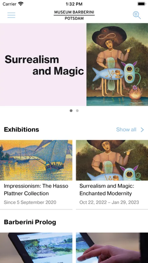 To use the Barberini App, make sure you have an internet connection. Free WiFi is available in the Museum Barberini. We recommend activating Location Services and Bluetooth to discover all the information and features of the app.