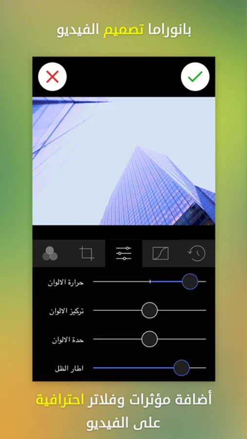 يساعدك تطبيق بانوراما الفيديو على تحرير الفيديو الخاص بك واضافة المؤثرات والفلاتر الاحترافية عليه والتحكم بشكل كامل بالاضاءة ووضوح الفيديو وتباين الالوان