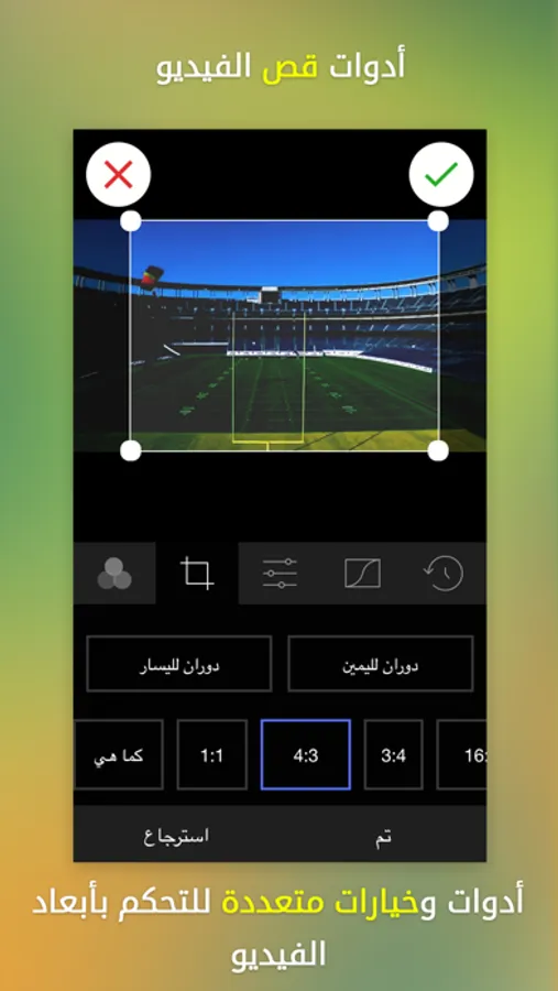 كما يمكنك من خلاله قص ابعاد الفيديو أو تحديدها من جديد , وتتوفر ايضا خاصية قلب الفيديو أو دوران الفيديو وتغيير اتجاه المقطع