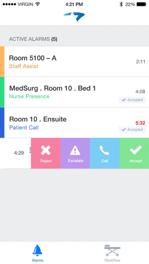 • Virtual workflow allows nurses to accept, reject, cancel, and escalate alarms