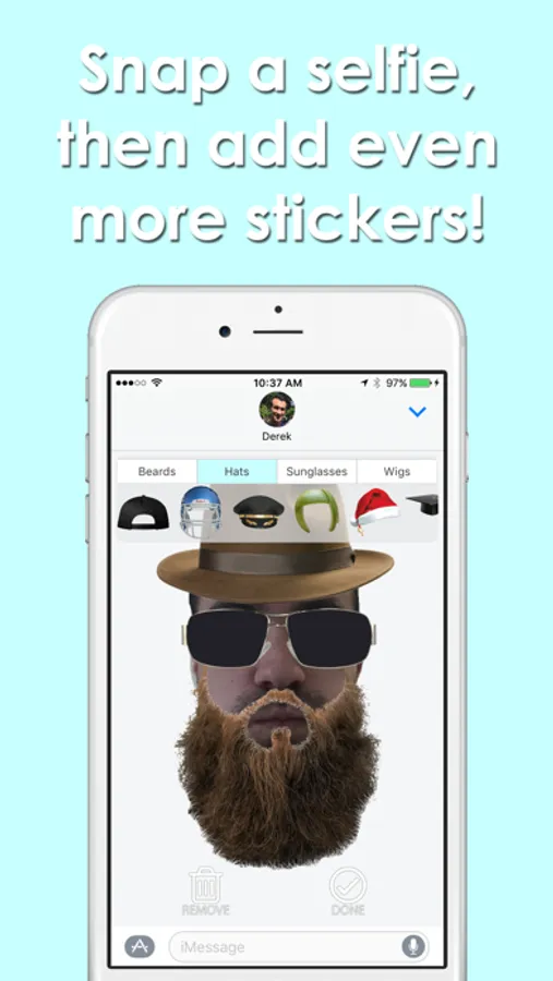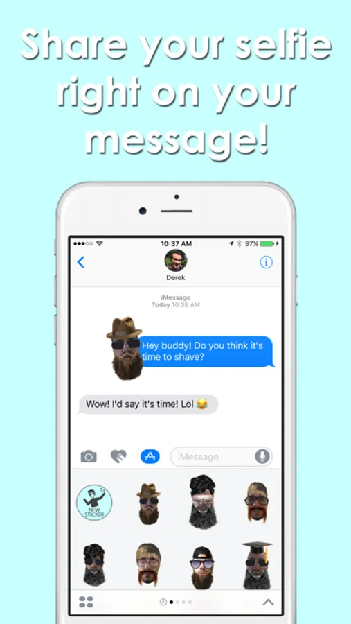 Selfies, Sticker app for iMessage, brings the power of your selfie and your creativity to iMessage. Take a selfie, crop your own face, or have the app help crop, then save the sticker to your drawer. It's that easy! Want to spice up your selfie with a fun hat, beard, or sunglasses? You can even add more stickers on top of your sticker.