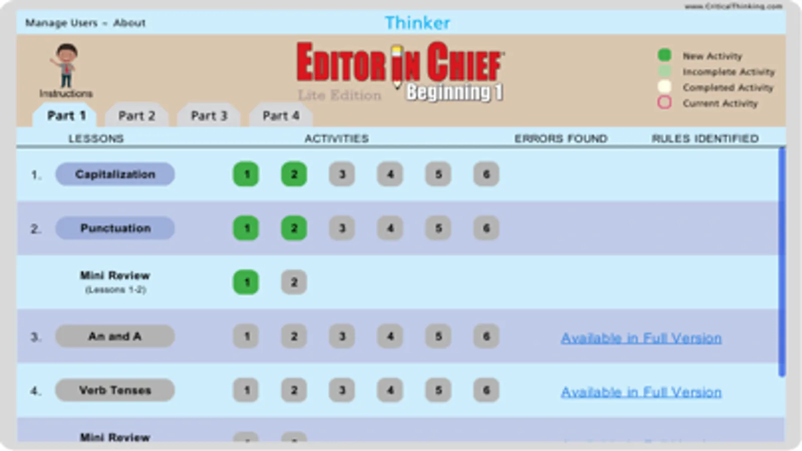 Editor in Chief® Beginning 1 includes lessons and practice with the following concepts: