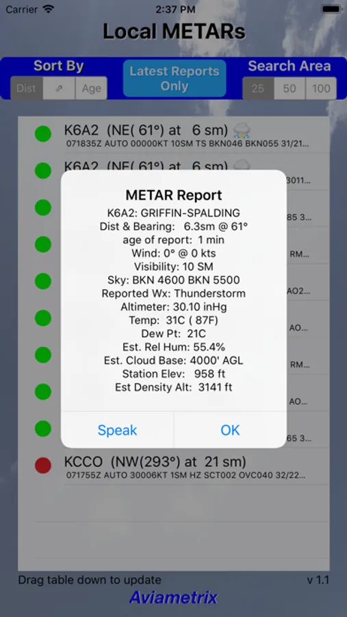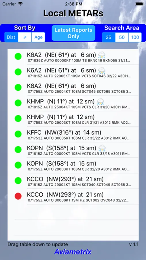 These reports come straight from the National Weather Service and reports are updated every few minutes. Drag down on the Table of reports and the app will pull a fresh update from the server.