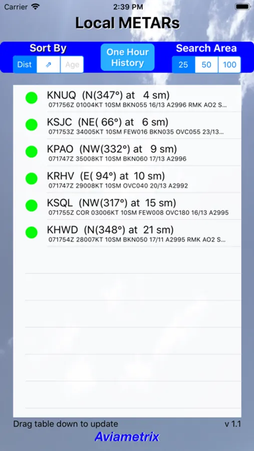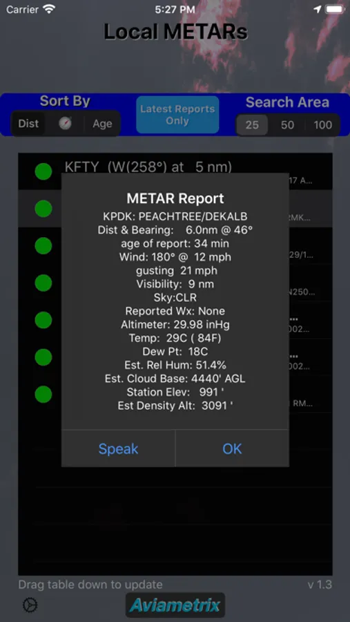 Run the app and up pops a detailed, translated METAR report from the closest station. Of course, you get all the nearby METAR reports, sorted by Distance or Bearing from your current location, or by age of the report. The app will fetch the last hour's reports, so you can look for trends at the Stations you are interested in. Press a button and the reports get filtered to show only the latest report from each station.