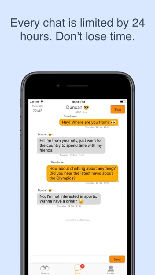 Every chat is limited by 24 hours. Don't lose time. Find hot topics to discuss and make friends before time is over.