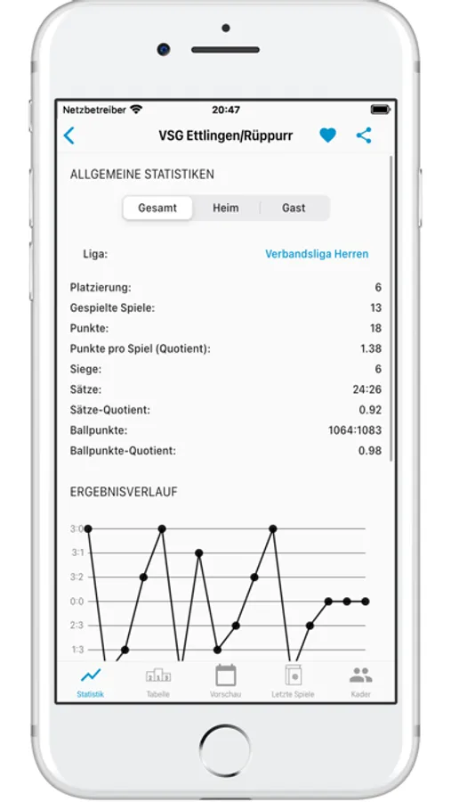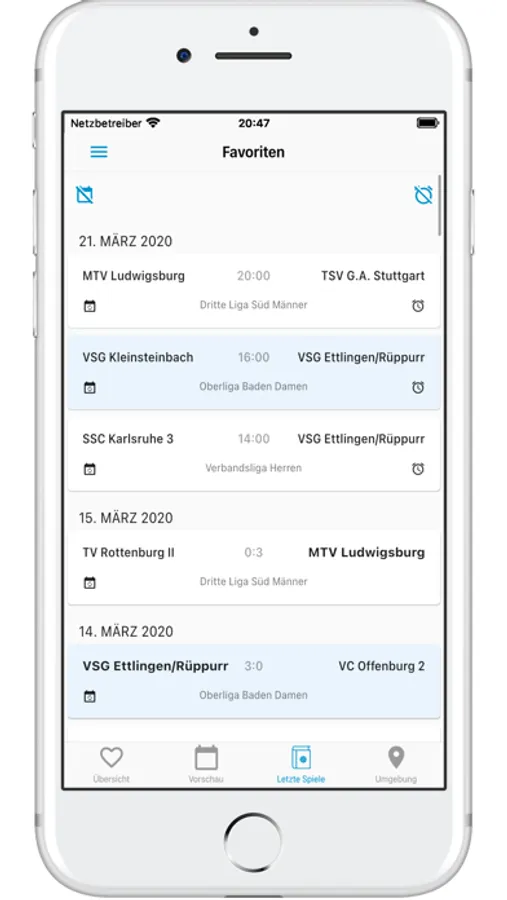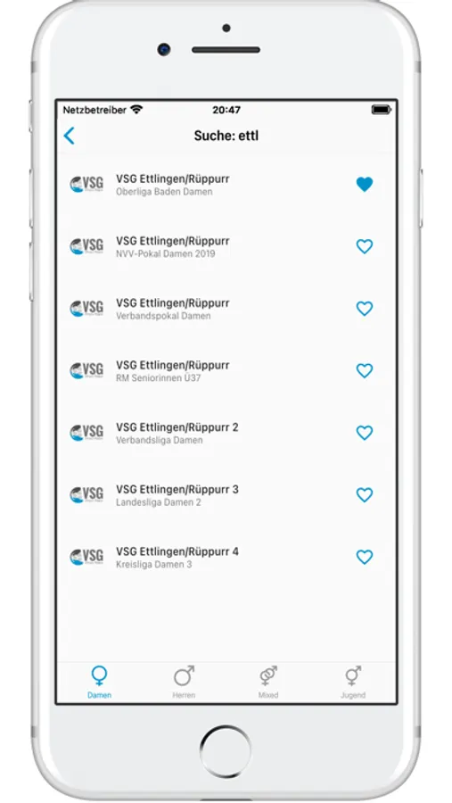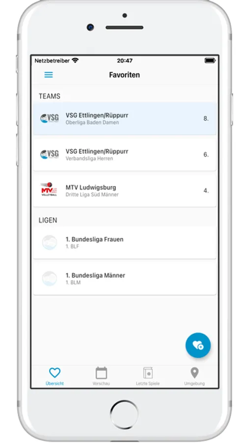 Wähle aus den angebotenen Verbänden deine Lieblingsteams und -ligen aus und füge sie zu deinen Favoriten hinzu. Greife bequem über die Favoriten-Ansicht auf deren Spieltage, Ergebnisse und Statistiken zu und gebe jedem Favorit ein individuelles Bild. Auch auf die Tabellen, Spiele und Ergebnisse von Teams oder Ligen, die nicht zu den Favoriten hinzugefügt worden sind, kann über die Suchfunktion zugegriffen werden.