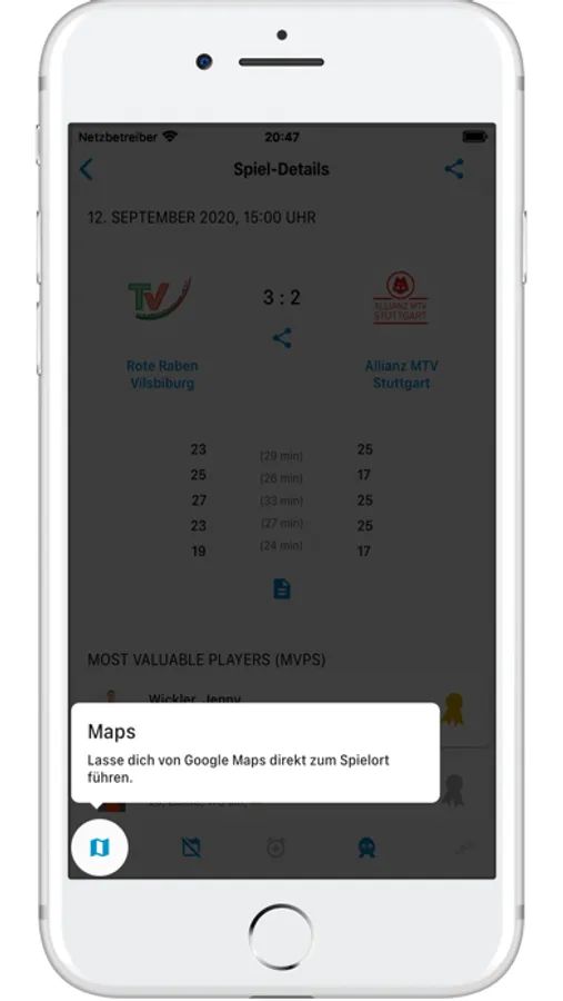 - Die Spielorte können per Klick mit Apple-Maps angezeigt werden