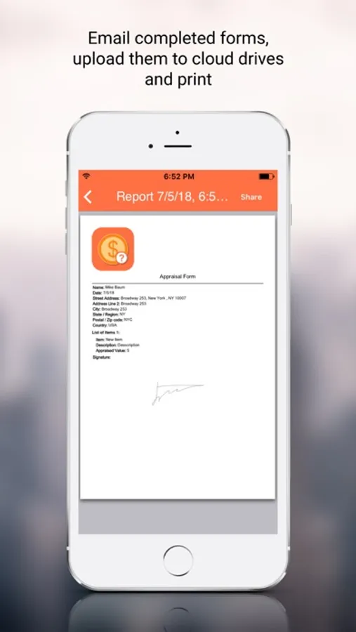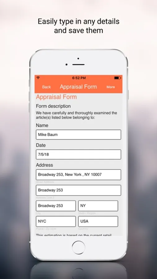 Perfect app for appraisers. Fill in the appraisal form with the list of items and client's information. Complete the estimation directly from your tablet or smartphone and send it via email. This app can be customized and extended to meet your specific business needs.