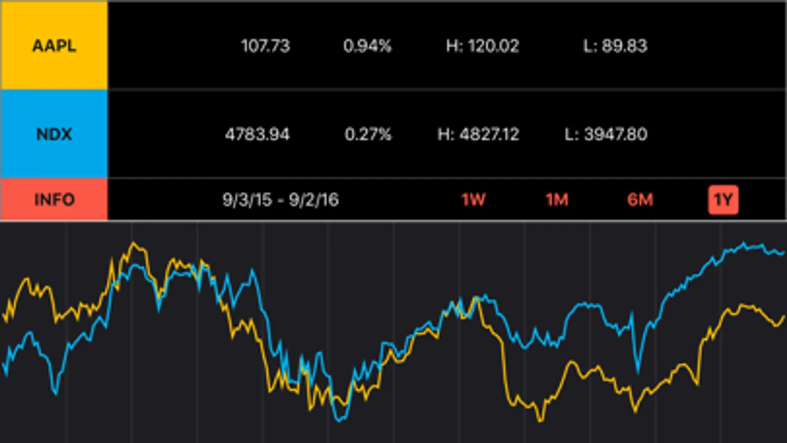 The bottom half of the screen contains the line graph(s). Drag a finger left and right in this area to play an audio representation of the line. Tap anywhere on the graph to hear the price and date at that point. Swipe up or down in this section to switch between graphs.