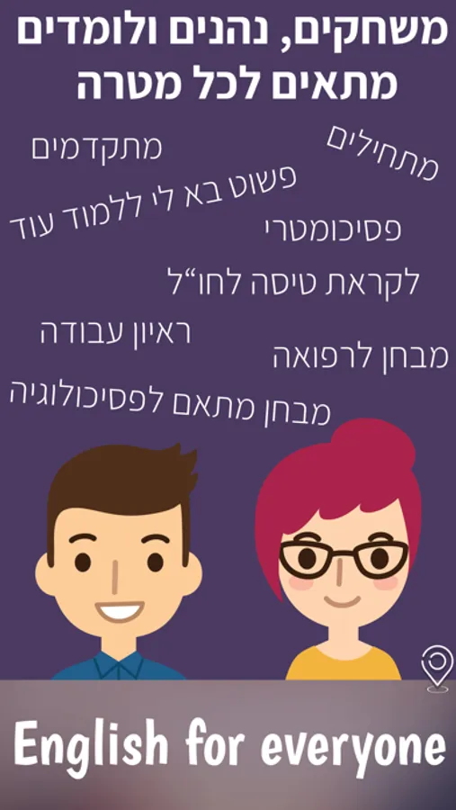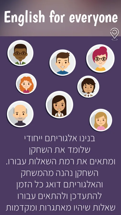 מטרת האפליקציה- לימוד אנגלית לכל הרמות כך שכל אחד לומד לפי הרמה שלו ומתקדם ככל שמשחק.