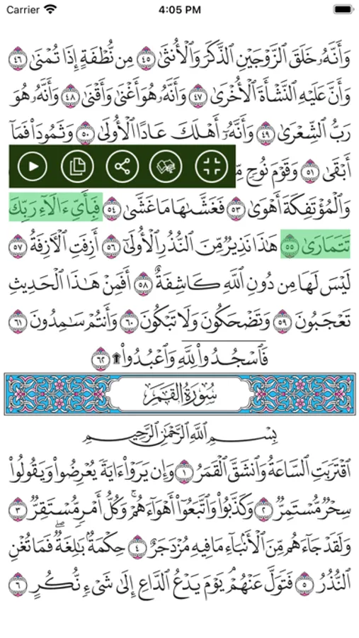 5. Mushaf Text / Ayat Selection, Copy, Share, Tafsir.