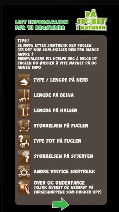 I Naturen - Fugl er en kunnskaps-app som er ment for barn og ungdommer som ønsker å øke sin kjennskap til fugler i norsk natur. Plutselig ser du en fugl stående utenfor viduet ditt eller ved bussholdeplassen, hvilken fugl er dette tenker du kanskje?