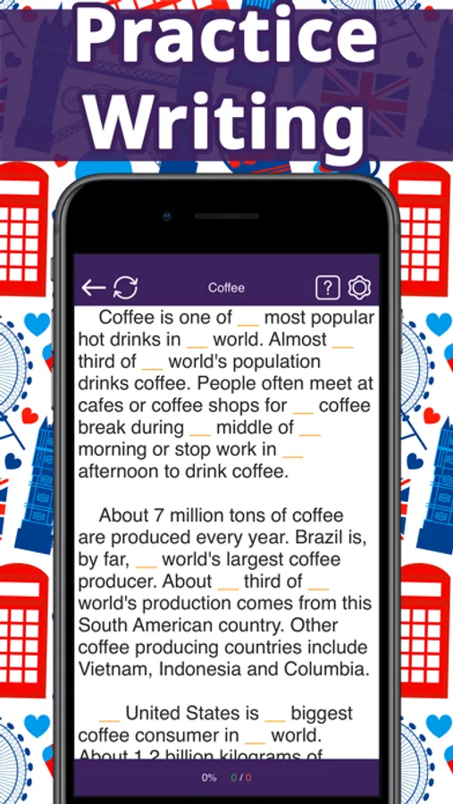 In our application, you will find articles divided by topic. You can only read what is interesting to you. Thanks to the large number of themes, you can find the text to your taste. There will be no articles in the text you selected. You need to read the sentence carefully and insert the missing article correctly.