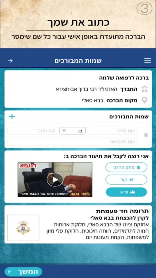 באפליקציה תוכלו לצפות בברכה שקיבלתם בוידאו אישי, לשמוע באודיו, או לקרוא את הברכה בחתימת הרב.