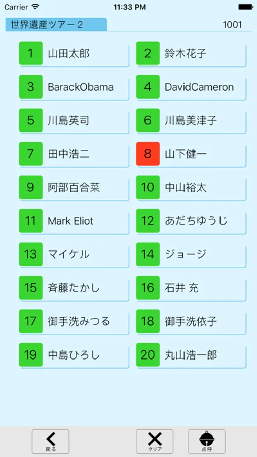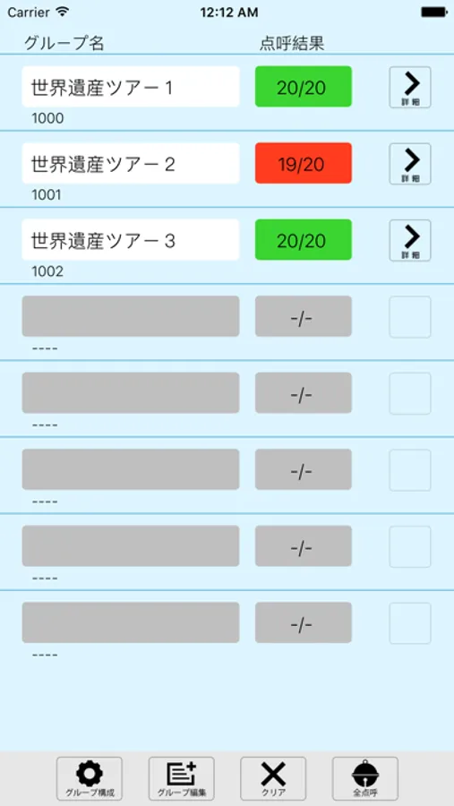 アプリは、グループ毎に管理できるので、グループ内の不在者が一目でわかります。1グループは20名、8グループまで管理できます。