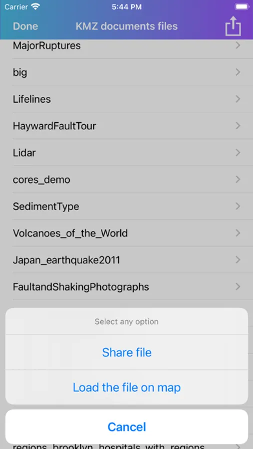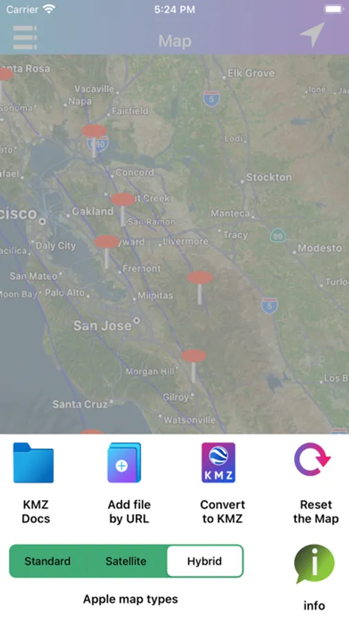 2)load kmz file on map.If the file contains markers, then tap on the marker to see the detail description of marker like Description,email id, url links,phone numbers,Images,Web site page.
