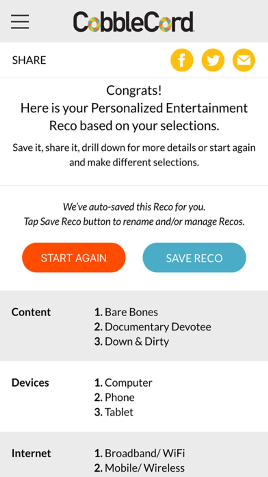 The next step is up to you. You can drill down for more information, save your “Reco” to your account, share it with the world or go forth and cobble your perfect package together. And relax, there’s no pressure. Entertainment choices and circumstances change every day. You can redo the process over and over. It’s TOTALLY FREE and there are no obligations. You are in total control.