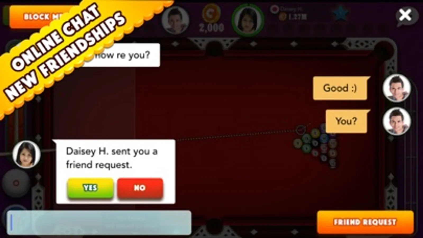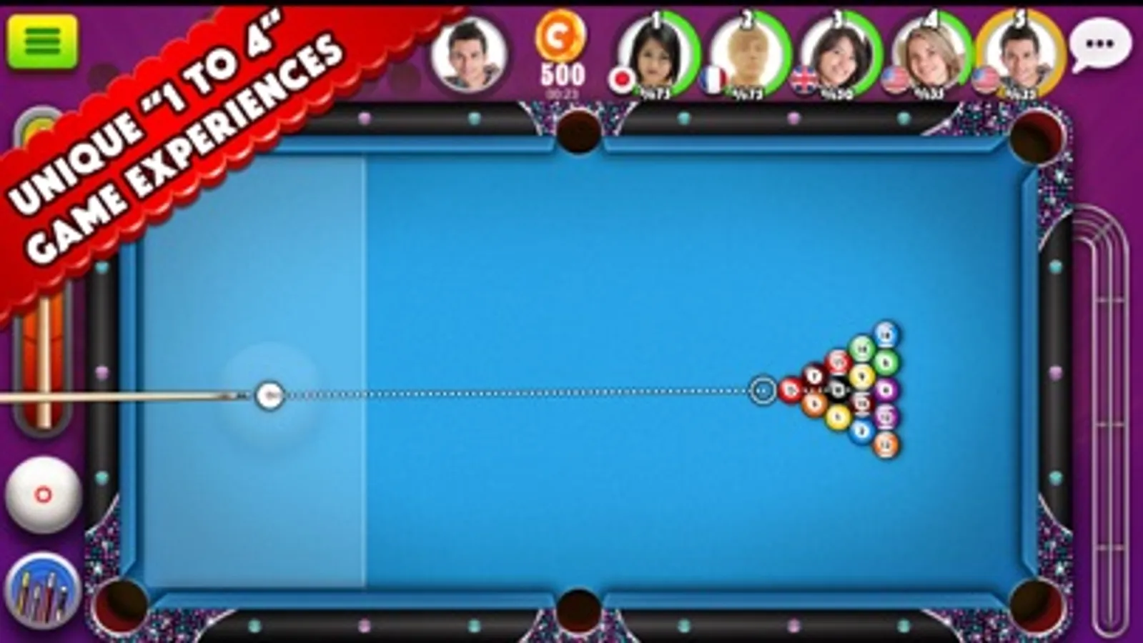 Quick billiard game with "play now" or use the "lobby" to choose your ball pool game friend; social and enjoyable online game with worldwide "chat".