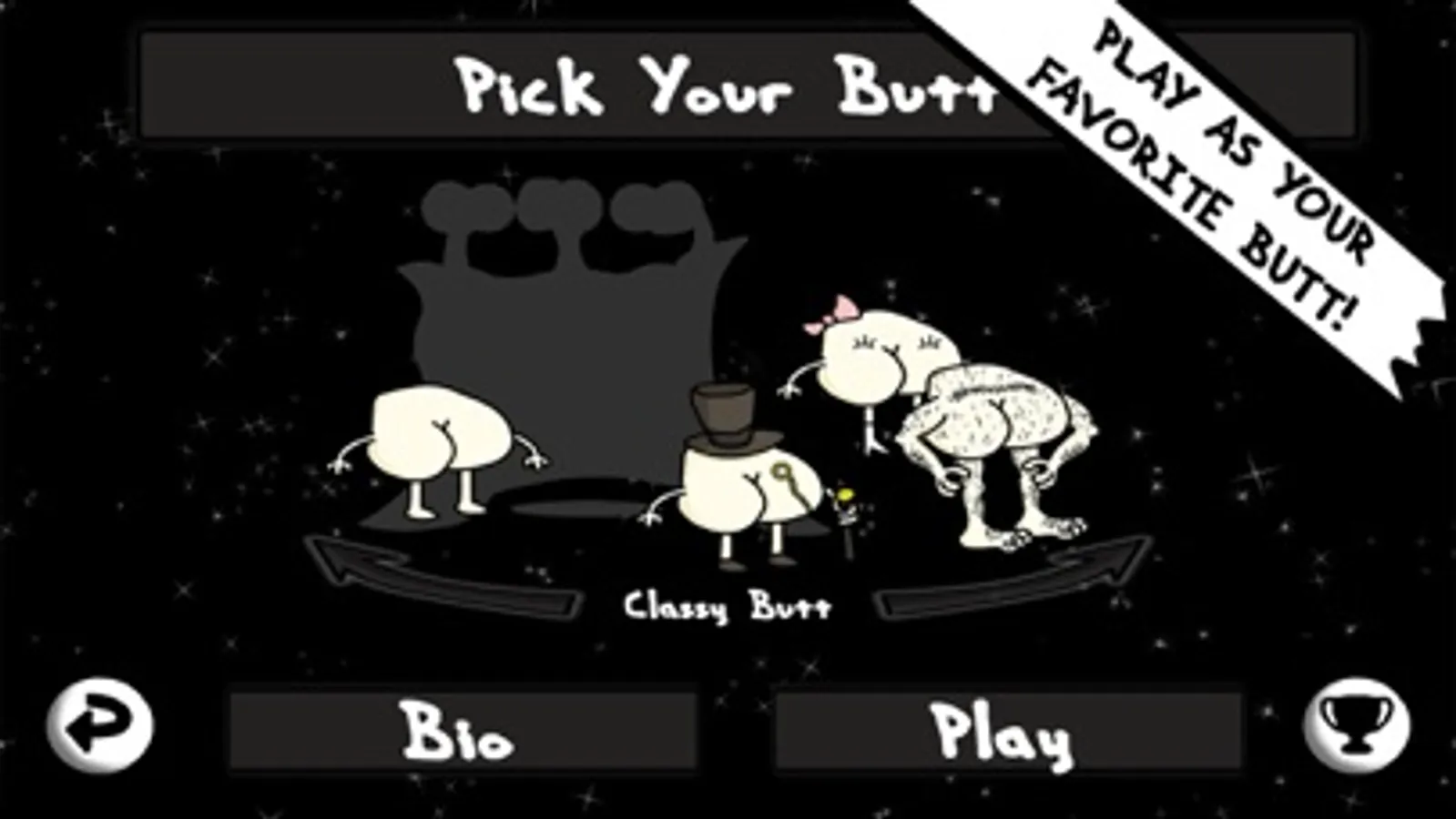 Play as Bow Butt, Hairy Butt, Classy Butt, or Butt Butt in this unique space adventure. Evil Butt has stolen all of the toilet paper in the universe and left you stranded among the stars. Dodge asteroids, gather parts to repair your toilet spaceship, and collect designer toilet paper and plungers while maneuvering through space.