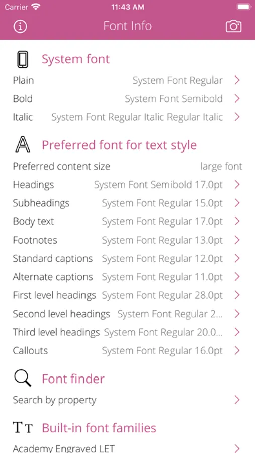 • Detect the fonts and sizes associated with the text style (headings, body, footnotes, captions, etc) and scaled appropriately for the user's selected content size category.