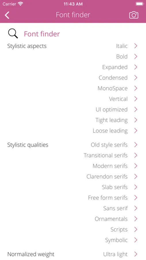 • Search font faces by traits, stylistic aspects and qualities.