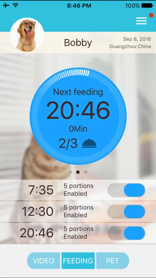 セットされた給餌時刻になると、スマートフォンに通知が届き、リアルタイムビュー動画でペットの様子が確認することができます。このときの映像はボタンひとつで録画もできます。