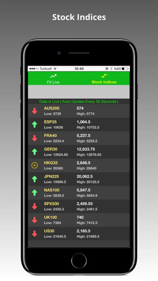 LiveFX provides you live data of fx rates and world stock indexes. You can choose indexes or fx rates you are interested in for your personal page and only follow them only. Data is live and updated every 30 seconds. Follow the markets online and don't miss opportunities !