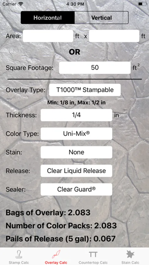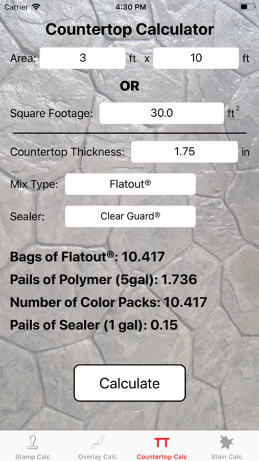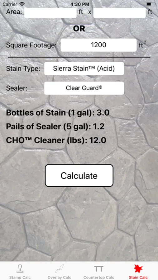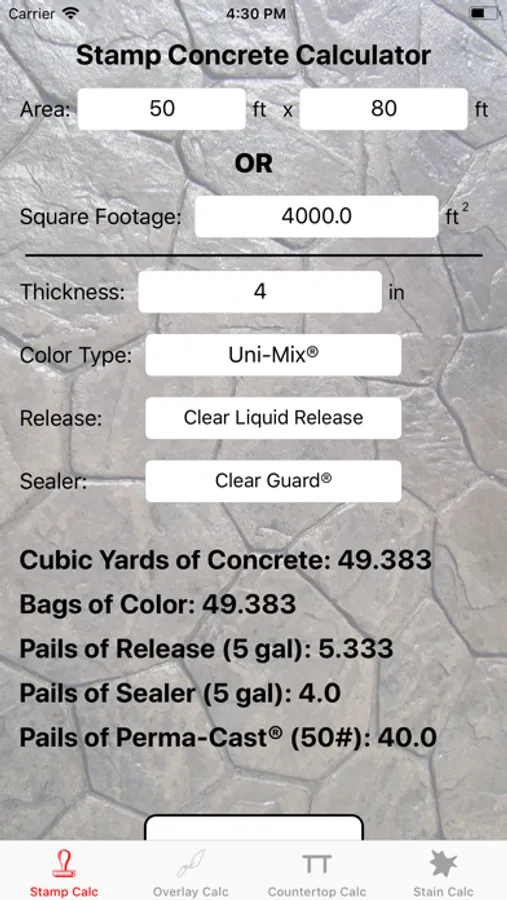 Stamp Concrete Calculator is a multi-function calculator allowing you to easily calculate the amount of color, release, sealer, and overlay mix for stamp concrete and overlaid concrete. Additionally, this app provides calculations for concrete countertops and concrete stain. This calculator is specifically designed for Butterfield Color® products.