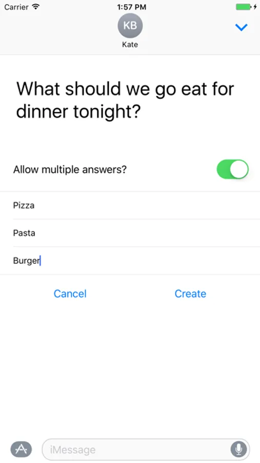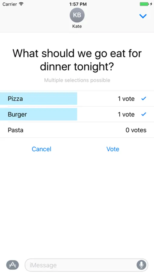 Survi lets you easily create polls right from the Messages App. So, you and your friends can vote which movie you want to see, where you want to go for dinner etc. without even having to leave the ongoing conversation.