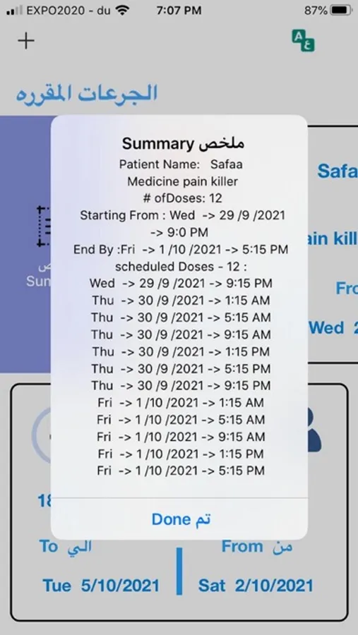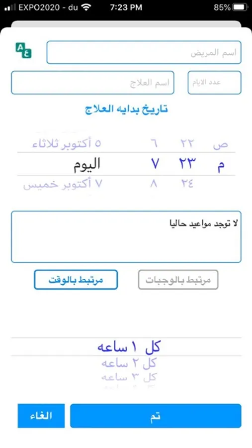 و من ثم سيقوم التطبيق بشكل تلقاءي بتحديد مواعيد العلاج و التذكير بها