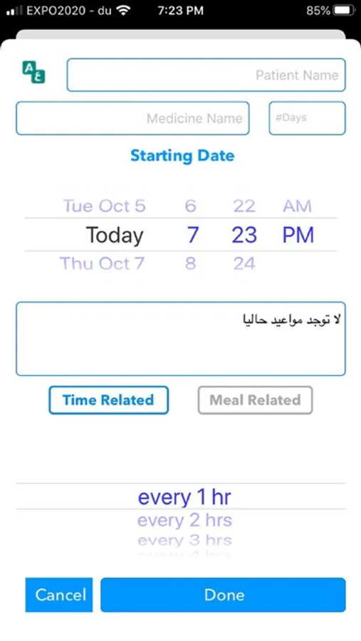 كل ما عليك هو ادخال اسم المريض و اسم الدواء و تحديد عدد الايام ثم تحديد اذا كان الدواء مرتبط بالطعام او بعدد الساعات.